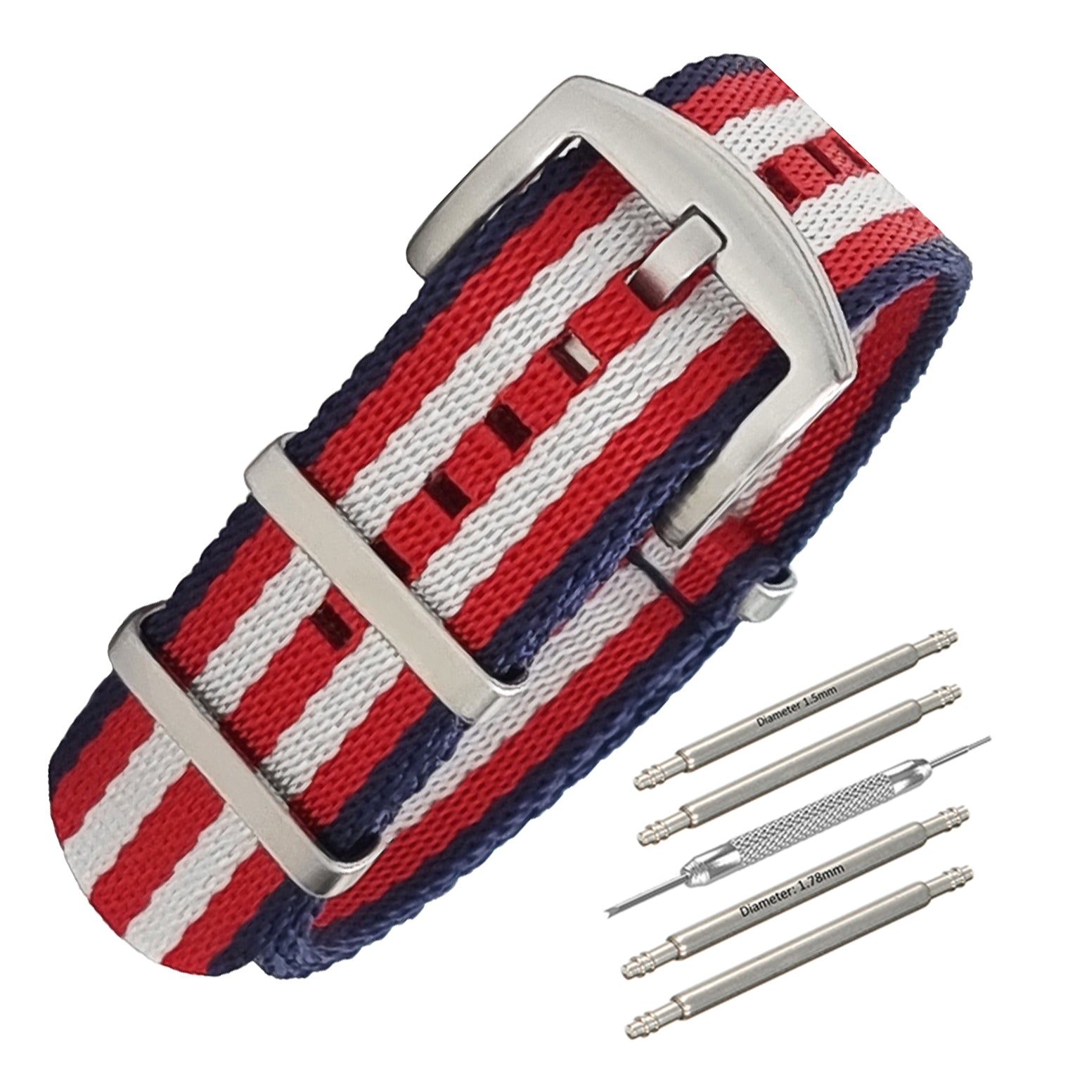 Cinturino per orologio da uomo Masar NATO in nylon rosso, bianco e blu navy / fibbia satinata - compatibile con Omega - "Frenchie". Misura 22 mm.