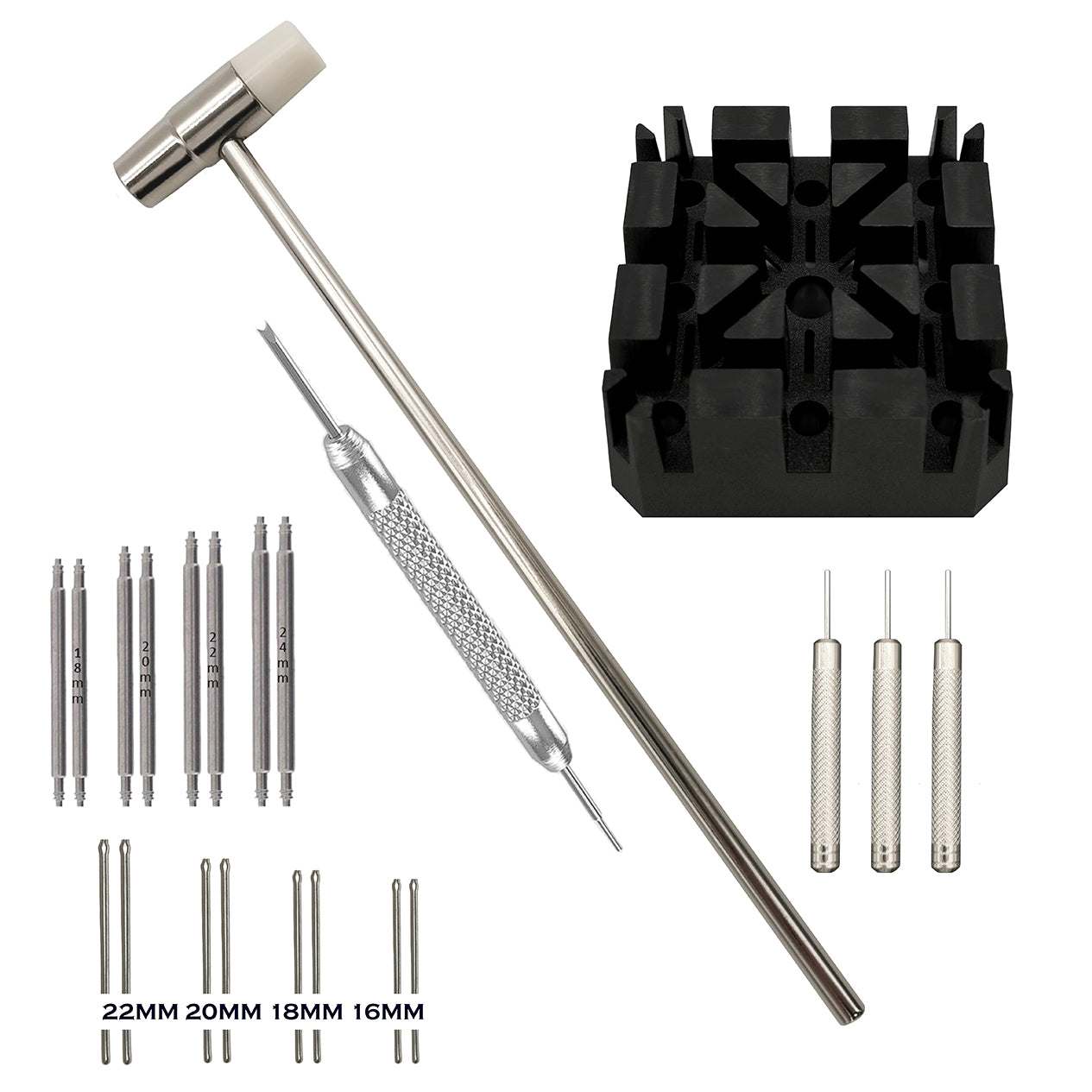Martello , supporto e perni Punzonatrice per un facile montaggio e smontaggio dei cinturini degli orologi.