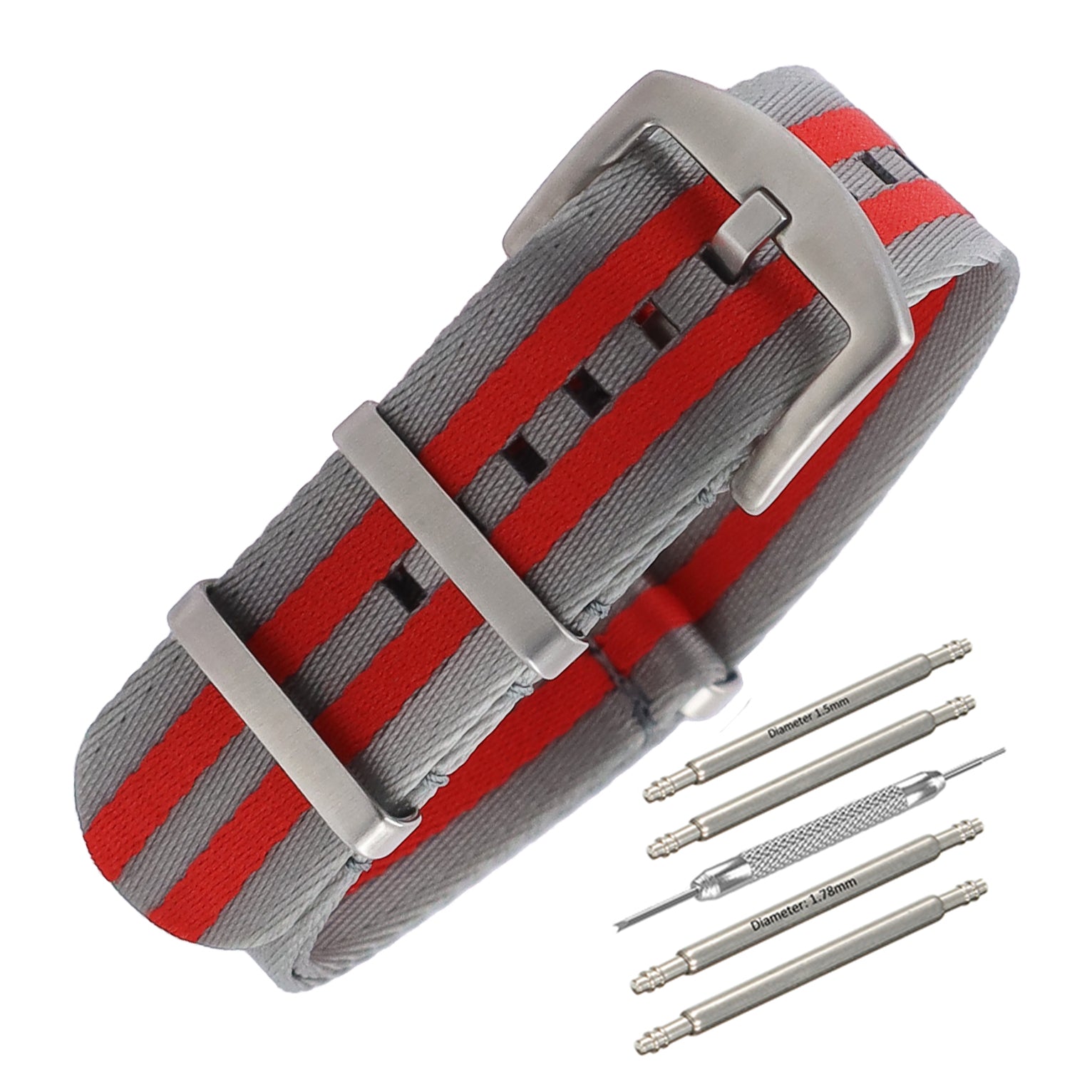 Cinturino per orologio da uomo Masar NATO in nylon grigio con 2 strisce rosse e fibbia in raso.